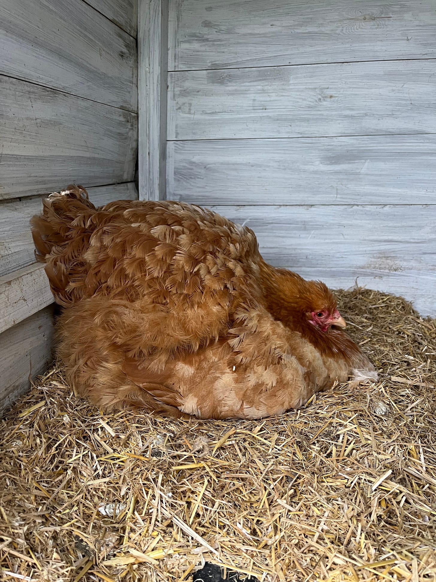 Purring and sitting tight on fake dummy eggs in a trance like state of self- neglect and raging hormones, one of the lowest ranking hens of the flocks pecking order has chosen to indeed go broody at last.